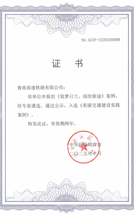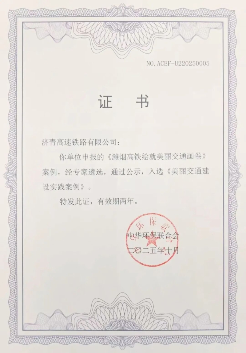 10月29日,由中华环保联合会主办的2025绿色低碳交通发展论坛在苏州举行,会上发布了“美丽交通建设实践案例”。凭借在铁路项目绿色建设、沿线生态高效保护等方面取得的卓越表现,金牌影院 日兰高铁、潍烟高铁2项案例成功入选并获颁证书。