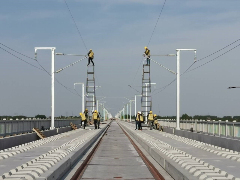 潍莱高铁全线设计承力索284.95条公里,正馈线219.37条公里、保护线219.37条公里、回流线3.762条公里、供电线56.41条公里,各类支柱4797根,硬横跨20组,预计6月底完成。