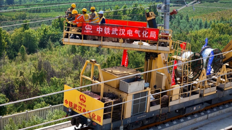 上午9时,在潍烟高铁DK154+443施工现场,随着现场负责人一声令下,恒张力放线车缓缓启动,在作业车和施工人员的配合下,经过起锚、放线、滑轮悬挂固定、线索终端制作、落锚及中锚架设等一系列标准化操作,首条接触导线架设顺利完成。